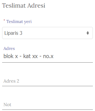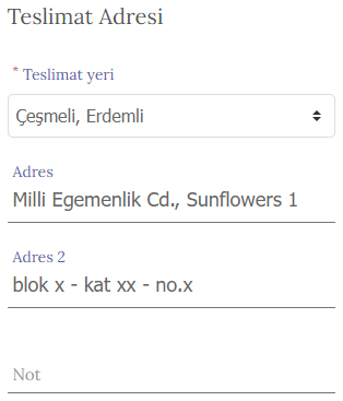 - Siparişinizin teslim edilmesini sağlamak için lütfen aşağıdaki metin alanlarını kalan gerekli teslimat adresi bilgileriyle birlikte doldurun (örn. sokak, apartman, daire, blok, kat vb.).